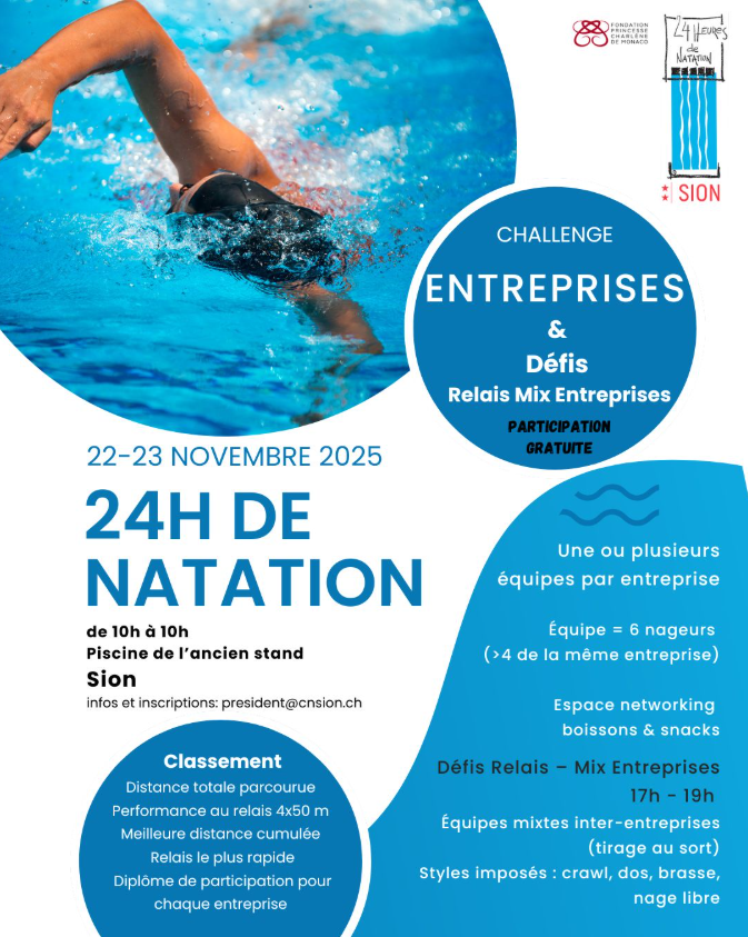 Le sport, la cohésion d’équipe et le networking se donnent rendez-vous à Sion les 22 et 23 novembre 2025 pour une édition inédite du Challenge Entreprises dans le cadre des 24 Heures de Natation !